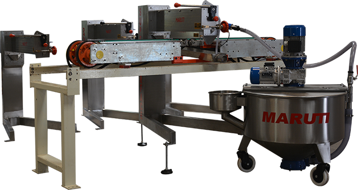 Waterfall system feeded by double motorized stirring mixer for the application of glazes, engobes and transparent frits. Its specific cantilever structure makes possible to easily control, manage and install it on any production lines.